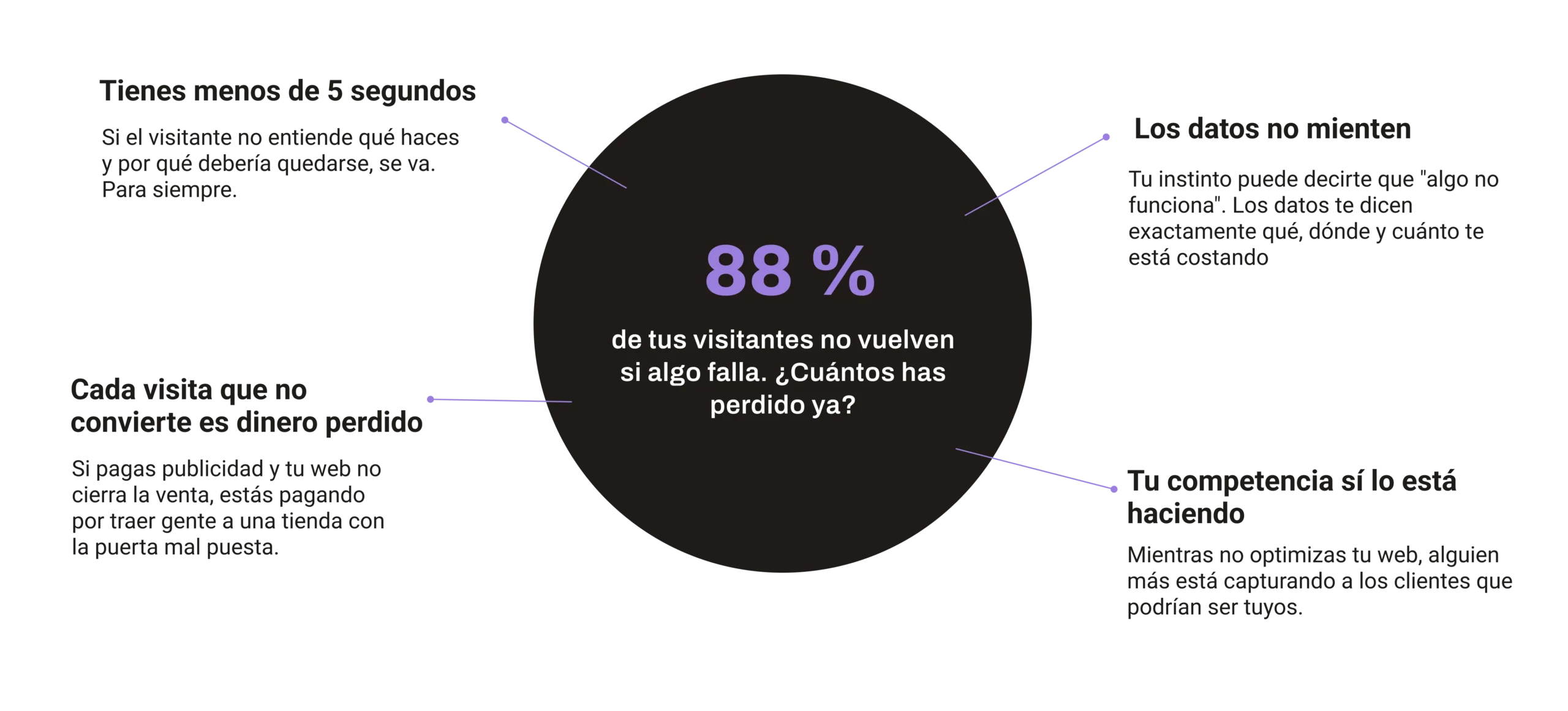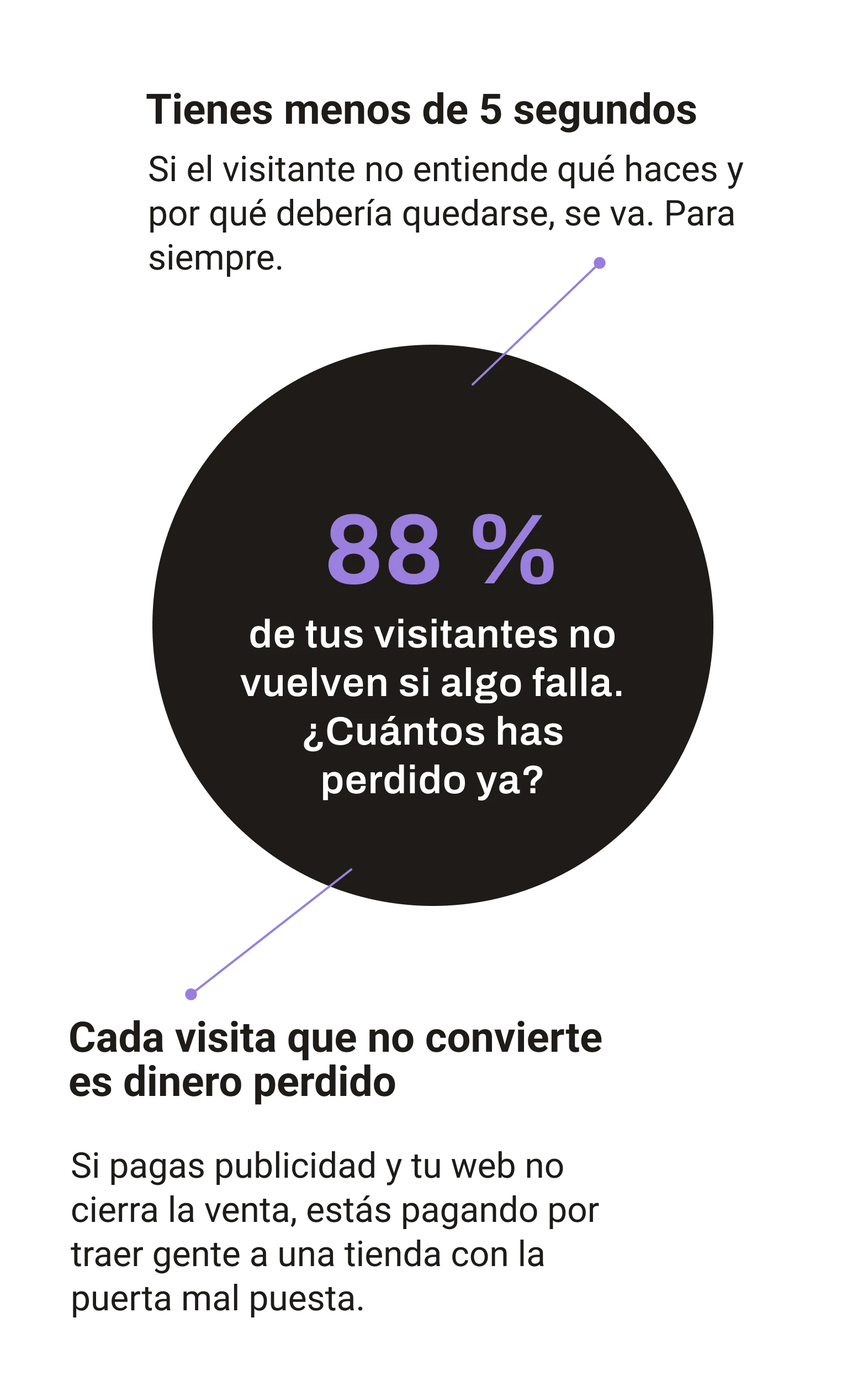 Un diseño bonito no es suficiente si el usuario no entiende por qué elegirte o el proceso le genera fricción. Ahí es donde pierdes ventas.